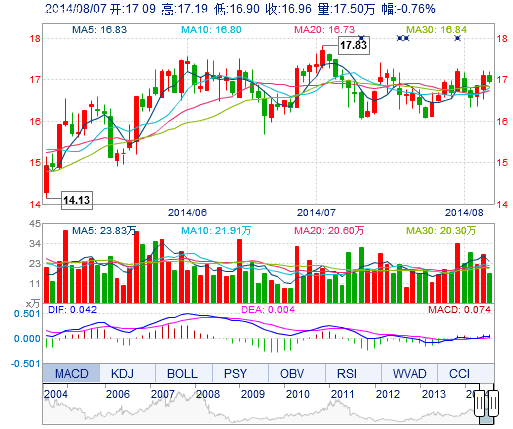 | 今 開: | 17.09 | 成交量: | 17.50萬手 | 振 幅: | 1.70% |