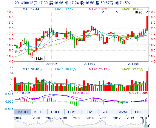 今開: 17.30 成交量: 60.67萬(wàn)手 振幅: 9.92% 最高: 18.96 成交額: 10.98億元 換手率: 6.34% 最低: 17.24 總市值: 196.13億 市凈率: 5.32 昨收: 17.34 流通市...