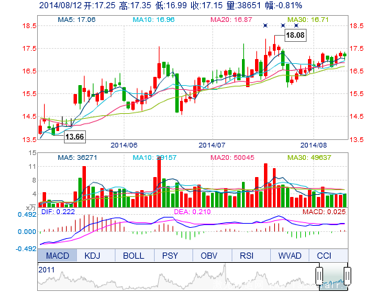 | 今 開: | 17.25 | 成交量: | 3.87萬手 | 振 幅: | 2.08% |