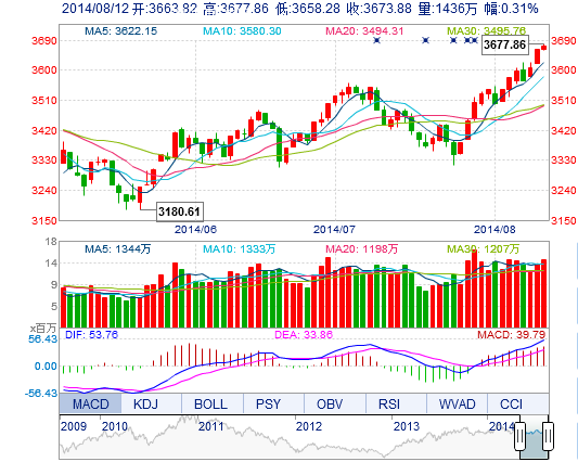 今開: 3663.82 最高: 3677.86 昨收: 3662.68 最低: 3658.28 成交量: 1435.99萬手 振幅: 0.53% 成交額: 228.05億元