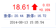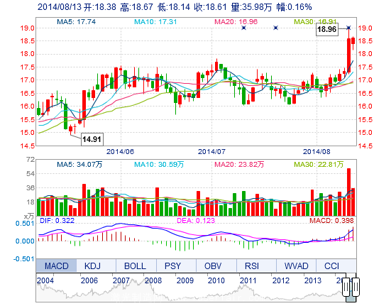今開: 18.38 成交量: 35.98萬手 振幅: 2.85% 最高: 18.67 成交額: 6.62億元 換手率: 3.76% 最低: 18.14 總市值: 196.44億 市凈率: 5.33 昨收: 18.58 流通市值...