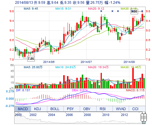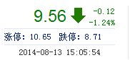 今開: 9.59 成交量: 26.75萬手 振幅: 3.00% 最高: 9.64 成交額: 2.54億元 換手率: 3.00% 最低: 9.35 總市值: 85.19億 市凈率: 3.18 昨收: 9.68 流通市值: 85...
