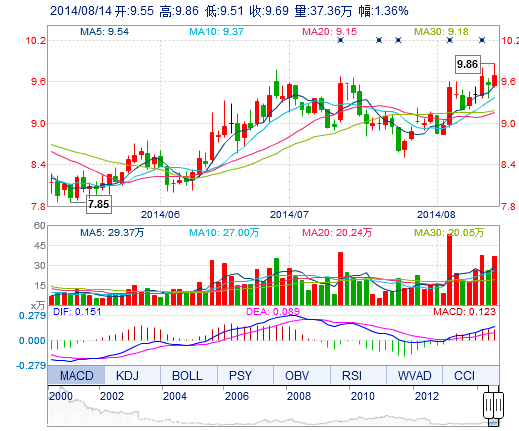 今開(kāi): 9.55 成交量: 37.36萬(wàn)手 振幅: 3.66% 最高: 9.86 成交額: 3.63億元 換手率: 4.19% 最低: 9.51 總市值: 86.35億 市凈率: 3.23 昨收: 9.56 流通市值: 86...