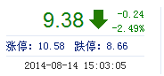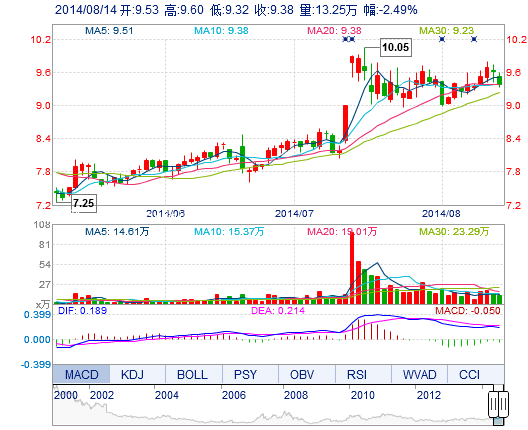 今開: 9.53 成交量: 13.25萬(wàn)手 振幅: 2.91% 最高: 9.60 成交額: 1.26億元 換手率: 3.03% 最低: 9.32 總市值: 40.97億 市凈率: 2.94 昨收: 9.62 流通市值: 40...