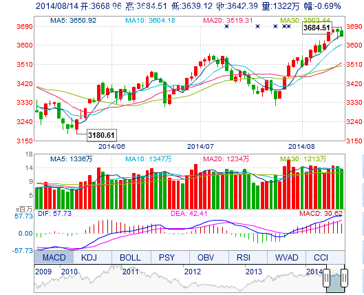 今開: 3668.96 最高: 3684.51 昨收: 3667.53 最低: 3639.12 成交量: 1322.08萬手 振幅: 1.24% 成交額: 210.05億元