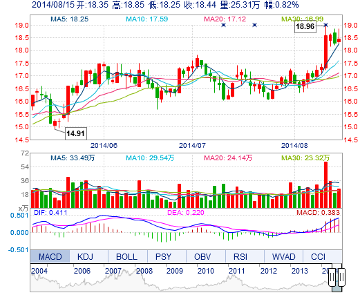 今開: 18.35 成交量: 25.31萬手 振幅: 3.28% 最高: 18.85 成交額: 4.70億元 換手率: 2.65% 最低: 18.25 總市值: 194.65億 市凈率: 5.28 昨收: 18.29 流通市值...
