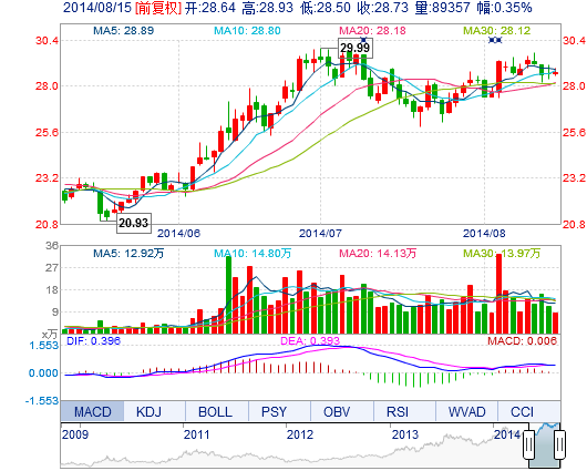 今開: 28.64 成交量: 8.94萬手 振幅: 1.50% 最高: 28.93 成交額: 2.57億元 換手率: 1.41% 最低: 28.50 總市值: 188.14億 市凈率: 11.07 昨收: 28.63 流通市值...