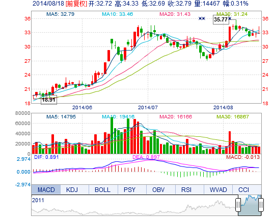 | 最 高: | 34.33 | 成交額: | 4767.76萬(wàn)元 | 換手率: | 5.43% |