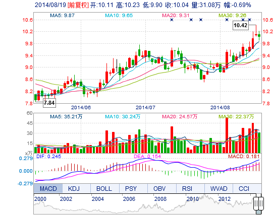 今開: 10.11 成交量: 31.08萬(wàn)手 振幅: 3.26% 最高: 10.23 成交額: 3.12億元 換手率: 3.49% 最低: 9.90 總市值: 89.47億 市凈率: 3.34 昨收: 10.11 流通市值:...
