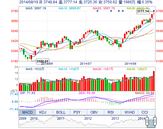 今開: 3748.84 最高: 3777.14 昨收: 3737.52 最低: 3725.36 成交量: 1986.05萬手 振幅: 1.39% 成交額: 321.19億元