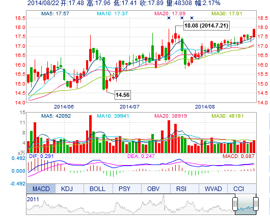 今開: 17.48 成交量: 4.83萬手 振幅: 3.14% 最高: 17.96 成交額: 8574.42萬元 換手率: 3.61% 最低: 17.41 總市值: 24.81億 市凈率: 6.74 昨收: 17.51 流通市...