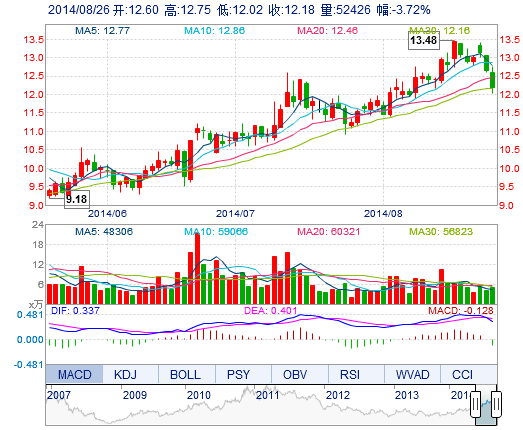 今開: 12.60 成交量: 5.24萬手 振幅: 5.77% 最高: 12.75 成交額: 6475.77萬元 換手率: 2.64% 最低: 12.02 總市值: 24.27億 市凈率: 4.86 昨收: 12.65 流通市...