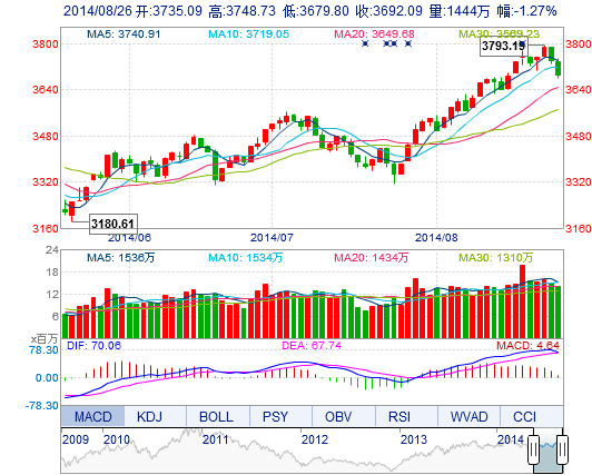 今開: 3735.09 最高: 3748.73 昨收: 3739.69 最低: 3679.81 成交量: 1443.61萬手 振幅: 1.84% 成交額: 266.23億元