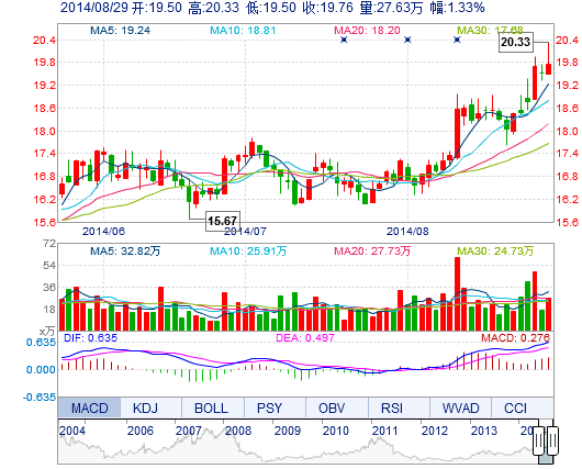 今開: 19.50 成交量: 27.63萬手 振幅: 4.26% 最高: 20.33 成交額: 5.54億元 換手率: 2.89% 最低: 19.50 總市值: 208.62億 市凈率: 5.66 昨收: 19.50 流通市值...