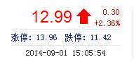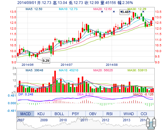 | 最 高: | 13.04 | 成交額: | 5821.46萬(wàn)元 | 換手率: | 2.27% |