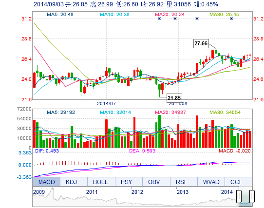 今開: 26.85 成交量: 3.11萬手 振幅: 1.46% 最高: 26.99 成交額: 8327.35萬元 換手率: 0.59% 最低: 26.60 總市值: 175.91億 市凈率: 9.67 昨收: 26.80 流通市...