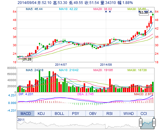 今開: 52.10 成交量: 3.43萬手 振幅: 7.41% 最高: 53.30 成交額: 1.76億元 換手率: 9.46% 最低: 49.55 總市值: 36.08億 市凈率: 12.27 昨收: 50.59 流通市值...