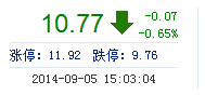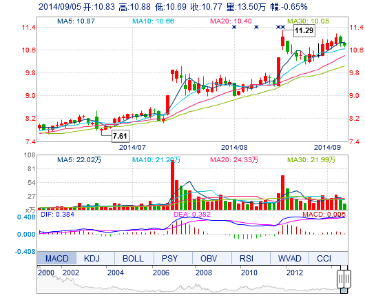 | 今 開: | 10.83 | 成交量: | 13.50萬(wàn)手 | 振 幅: | 1.75% |