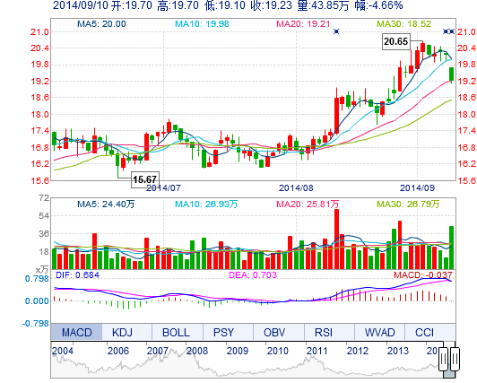 今開: 19.70 成交量: 43.85萬手 振幅: 2.97% 最高: 19.70 成交額: 8.45億元 換手率: 4.59% 最低: 19.10 總市值: 203.02億 市凈率: 5.51 昨收: 20.17 流通市值...