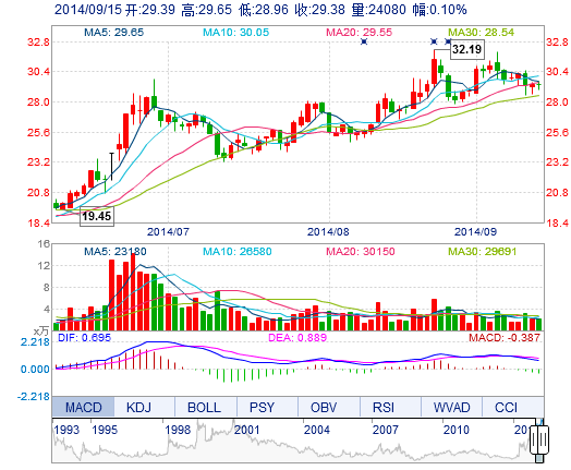 今開: 29.39 成交量: 2.41萬手 振幅: 2.35% 最高: 29.65 成交額: 7040.46萬元 換手率: 1.39% 最低: 28.96 總市值: 73.85億 市凈率: 14.64 昨收: 29.35 流通市...