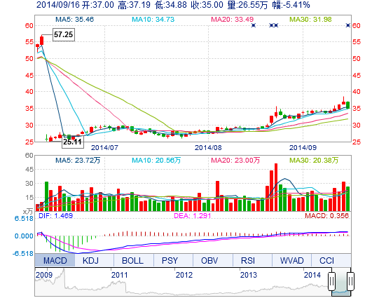 | 今 開: | 37.00 | 成交量: | 26.55萬手 | 振 幅: | 6.24% |