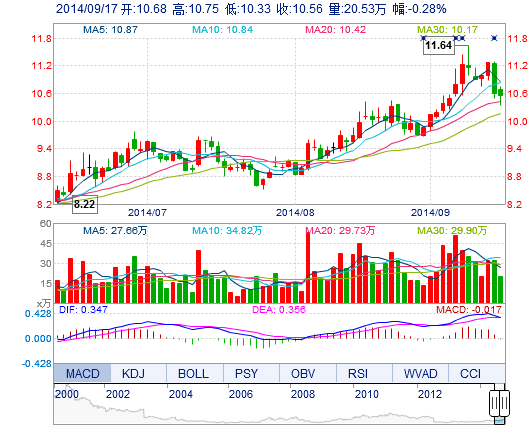 今開: 10.68 成交量: 20.53萬手 振幅: 3.97% 最高: 10.75 成交額: 2.16億元 換手率: 2.30% 最低: 10.33 總市值: 94.10億 市凈率: 3.48 昨收: 10.59 流通市值...