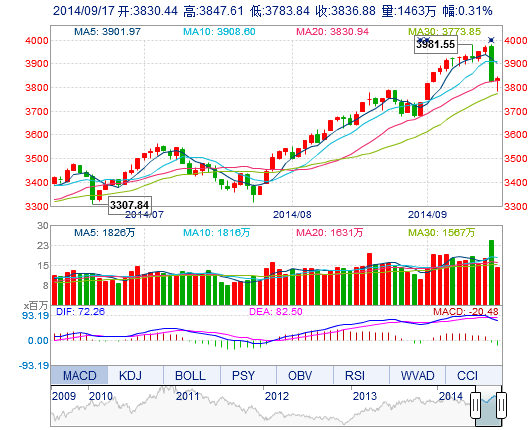 今開: 3830.44 最高: 3847.61 昨收: 3825.16 最低: 3783.84 成交量: 1462.89萬手 振幅: 1.67% 成交額: 226.28億元