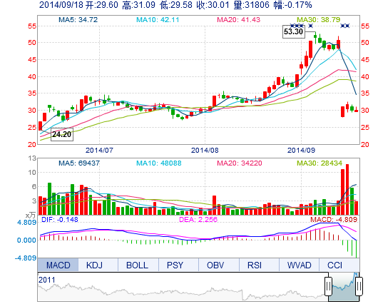 | 今 開: | 29.60 | 成交量: | 3.18萬手 | 振 幅: | 5.02% |