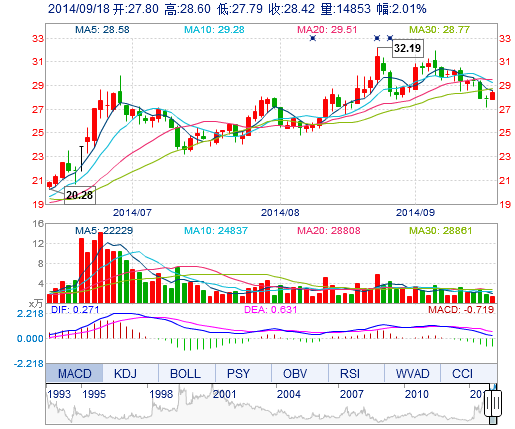 今開: 27.80 成交量: 1.49萬手 振幅: 2.91% 最高: 28.60 成交額: 4218.08萬元 換手率: 0.86% 最低: 27.79 總市值: 71.43億 市凈率: 14.16 昨收: 27.86 流通市...