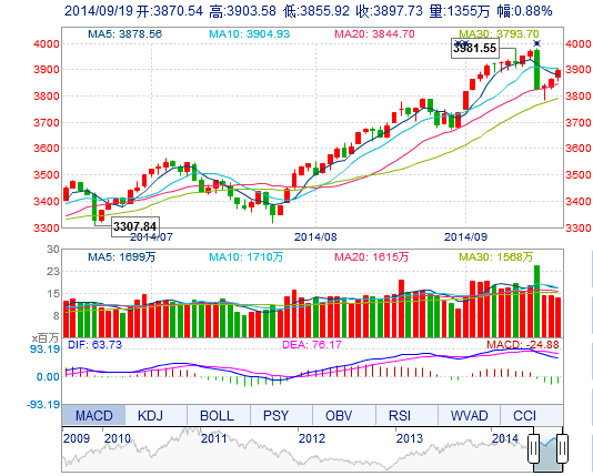 今開: 3870.54 最高: 3903.58 昨收: 3863.77 最低: 3855.92 成交量: 1354.76萬手 振幅: 1.23% 成交額: 214.41億元