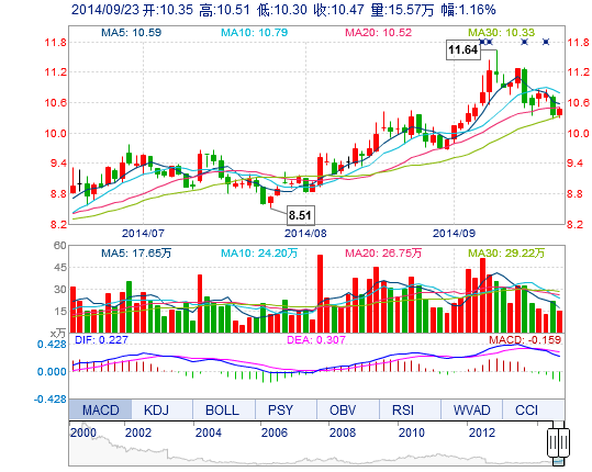 今開: 10.35 成交量: 15.57萬手 振幅: 2.03% 最高: 10.51 成交額: 1.62億元 換手率: 1.75% 最低: 10.30 總市值: 93.30億 市凈率: 3.45 昨收: 10.35 流通市值...