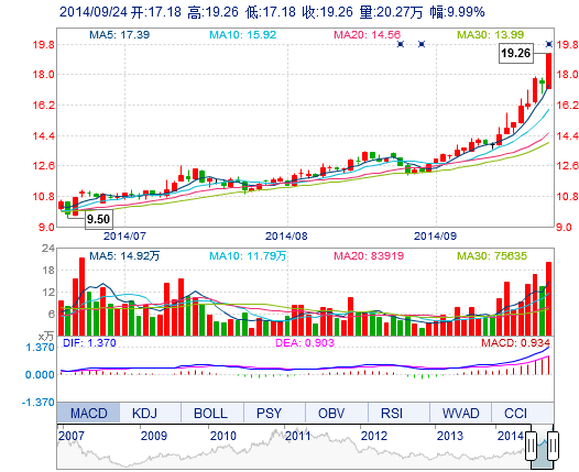 | 最 高: | 19.26 | 成交額: | 3.82億元 | 換手率: | 10.20% |