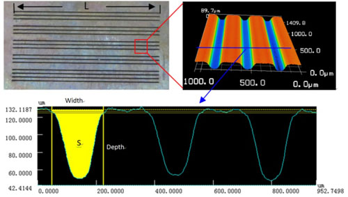 中科院寧波材料所先進(jìn)制造所張文武帶領(lǐng)的激光與智能能量場制造工程團(tuán)隊(duì),在自主研發(fā)的開放式五軸聯(lián)動(dòng)數(shù)控系統(tǒng)基礎(chǔ)上,與二軸掃描振鏡結(jié)合,開發(fā)出五軸聯(lián)動(dòng)300W皮秒激光加工和40W納秒激光加工系統(tǒng)。利用300W皮秒激光加工系統(tǒng),團(tuán)隊(duì)在銅,鋁,石英等材料上加工微槽,分析了不同加工參數(shù)條件對(duì)微槽寬度及深度的影響。該成果為焦俊科、阮亮、張?zhí)鞚?、張文武共同完成,并在美國底特律ASME 2014 Manufacturing Science andEngineering Conference上能量場制造論壇作為主題報(bào)告加以報(bào)道,引起與會(huì)學(xué)者廣泛興趣。