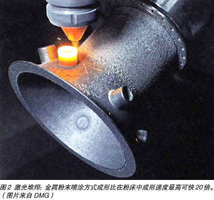 激光堆焊頭都安裝在HSK刀柄中。此工藝通過金屬粉末噴涂方式成形,這比在粉床中成形速度最高可快20倍。原理:金屬粉末被逐層堆焊在基體材料上,并且與基體材料熔合在一起。在此過程中,金屬粉末成為與基體表面結(jié)合的高強(qiáng)度焊劑。冷卻后,形成可進(jìn)行機(jī)械加工的金屬層。