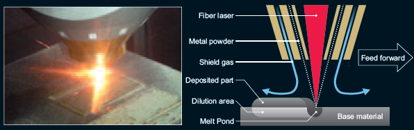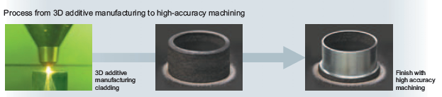 在操作中,INTEGREX I-400AM在噴嘴前端向工件表面噴出金屬粉末、同時(shí)照射纖維激光,在各母材上熔融、凝固金屬粉末。這種方法還能將母材與其他金屬?gòu)?qiáng)力接合起來(lái)。比如,在作為母材的“Inconel738”上,對(duì)用于航空領(lǐng)域部件的鎳基超合金“Inconel718”實(shí)施沉積成型。因此可用于修復(fù)磨損或損壞的零部件,如航空渦輪葉片等。