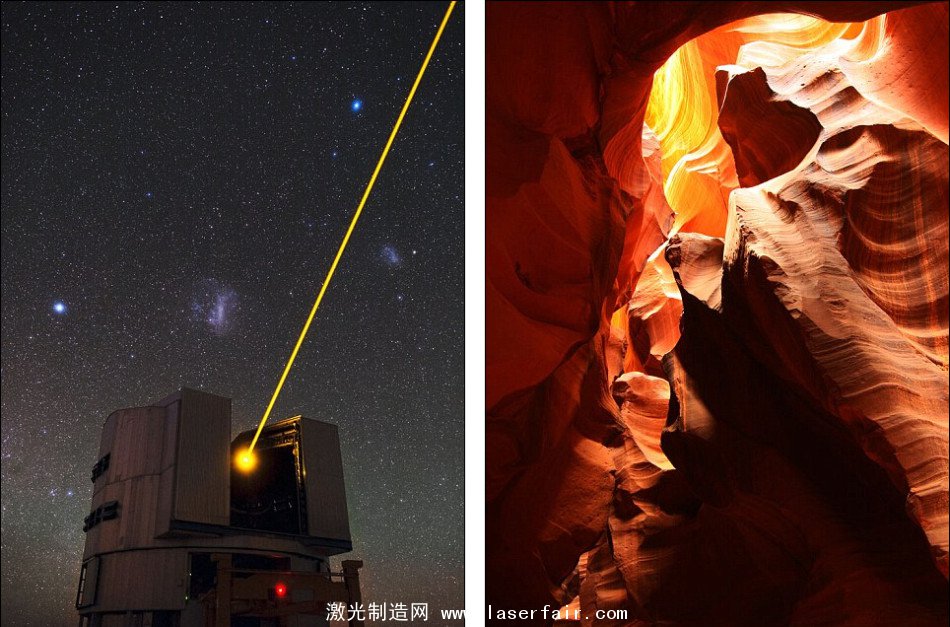 所有激光的原理都在于控制原子釋放光子的方式。激光可以讓光的能量集中在很小的范圍內(nèi)并照射到相對(duì)遙遠(yuǎn)的目標(biāo)。在左圖中,天文學(xué)家們利用激光測(cè)量地球大氣層擾動(dòng),從而為望遠(yuǎn)鏡修正光學(xué)誤差作為參考;而右圖展示的則是美國(guó)亞利桑那州的羚羊峽谷(Antelope Canyon)