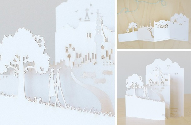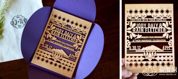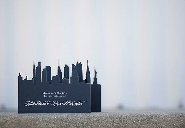 激光切割技術能讓請柬有更復雜的花樣,它的效果類似于傳統的中國剪紙。你的婚禮請柬完全可以摒棄四四方方的外形,而采用一種另類的造型,比如將請柬切割出上圖中的紐約城空中輪廓線,又或是在封裝上增加激光切割的細節(jié),制作奇妙美麗的腰封、信封或封套。