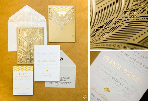 這款請柬的靈感來自于《了不起的蓋茨比》,金色與精致鏤空表現出裝飾藝術的奢華。