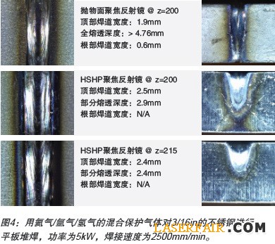 用氦氣/氬氣/氫氣的混合保護氣體對3/16in的不銹鋼進行平板堆焊,功率為5kW,焊接速度為2500mm/min,標準拋物面聚焦反射鏡具有高的功率密度,帶來的是更高的熔深,而代價是高的焊縫缺陷幾率(圖4上)。用HSHP聚焦反射鏡會帶來更寬的頂部焊道和更大的FUZ,從而提高熔融效率。若是熔深的要求低于2.9mm,HSHP聚焦反射鏡在相同的FUZ寬度下將帶來更高的速度(圖4中)。在2.4mm熔深要求下做實驗,HSHP聚焦反射鏡可以實現(xiàn)全功率的全速焊接(圖4下)。