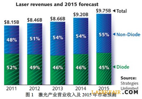 與2013年相比,2014年全球激光銷(xiāo)售額增長(zhǎng)6%達(dá)到92.03億美元。即使通脹回落給經(jīng)濟(jì)遺留許多停滯狀態(tài)及持續(xù)疲軟,包括光存儲(chǔ)、軍事和科技研發(fā)部門(mén),激光產(chǎn)業(yè)的不斷壯大和新興產(chǎn)業(yè)的大膽未來(lái),如3D打印、新經(jīng)濟(jì)的智能工具以及積極并購(gòu)活動(dòng)都會(huì)影響我們的正確預(yù)測(cè),對(duì)于2015年我們預(yù)測(cè)激光器銷(xiāo)售增長(zhǎng)6%,達(dá)到97.54億美元。