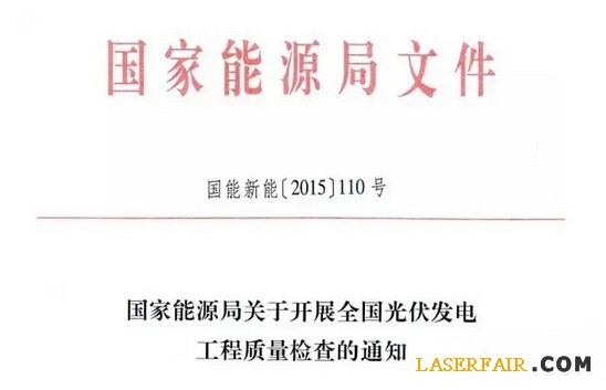 2015年4月7日,國(guó)家能源局向各?。ㄗ灾螀^(qū)、直轄市)發(fā)展改革委(能源局)、新疆生產(chǎn)建設(shè)兵團(tuán)發(fā)展改革委,各派出機(jī)構(gòu),國(guó)家電網(wǎng)公司、南方電網(wǎng)公司、內(nèi)蒙古電力公司,水電水利規(guī)劃設(shè)計(jì)總院、鑒衡認(rèn)證中心、中國(guó)質(zhì)量認(rèn)證中心、中國(guó)電力科學(xué)研究院下發(fā)——《國(guó)家能源局關(guān)于開(kāi)展全國(guó)光伏發(fā)電工程質(zhì)量檢查的通知》國(guó)能新能[2015]110號(hào)文件。