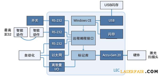 內(nèi)置的遠(yuǎn)程API功能還能讓制造商通過(guò)使用電腦、PLC或是其他連接設(shè)備來(lái)控制LEC。借助此功能,系統(tǒng)集成商設(shè)計(jì)的激光打標(biāo)設(shè)備可以讓工廠的工程師遠(yuǎn)程接入這些設(shè)備,同時(shí)還能以各種方式來(lái)操縱和控制數(shù)據(jù),包括TCP/IP協(xié)議以及通過(guò)網(wǎng)絡(luò)中的電腦、PLC或者智能手機(jī)/平板電腦發(fā)出的串口命令。