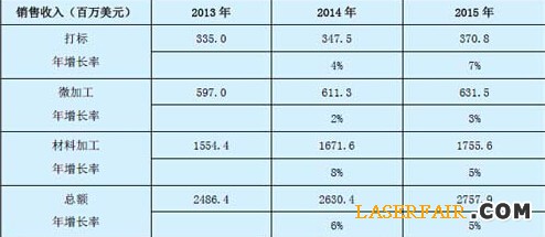 如表2所示,打標/雕刻市場是推動低功率激光類別增長的主要動力?;仡櫣I(yè)激光器從1970年開始的表現(xiàn),發(fā)現(xiàn)只有在兩個重要的市場逆轉(zhuǎn)點(1993年和2008年-2009年)時打標/雕刻市場的銷售才有所下降。該市場目前主要是靠質(zhì)量獲勝,因為低功率光纖激光器和CO2激光器的成本使得利潤難以維持。2014年銷售數(shù)量繼續(xù)保持個位數(shù)增長,預計2015年會略微增加。(2)微加工業(yè)務(wù)