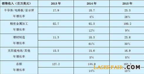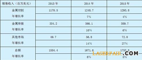 表1:所有的工業(yè)激光材料加工市場的銷售收入(貨幣單位:百萬美元)