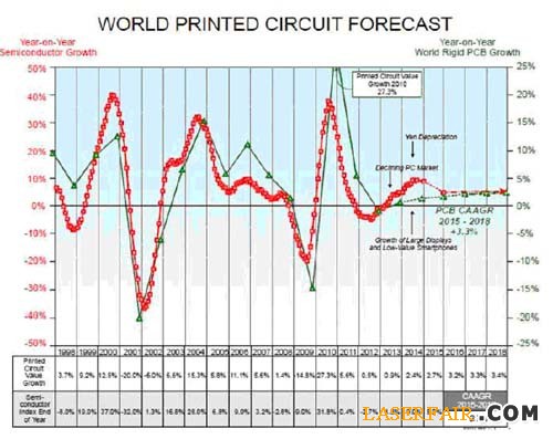 中國大陸作為全球電子產(chǎn)品主要的生產(chǎn)基地,帶動了電子產(chǎn)品所需要的PCB產(chǎn)業(yè)鏈轉(zhuǎn)移到中國大陸就近生產(chǎn)和供應(yīng),確立了中國大陸地區(qū)PCB產(chǎn)值全球第一的地位。根據(jù)市場調(diào)查機構(gòu)Prismark預計,2014年全球PCB市場增長2.3%,總產(chǎn)值達574.37億美元。預計2015年P(guān)CB產(chǎn)業(yè)的年增長率約為2.7%,未來5年年增長率約為3%。