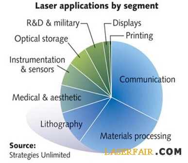 通信和光存儲(chǔ)仍然是激光產(chǎn)業(yè)最大的細(xì)分市場(chǎng),然后是材料加工和光刻激光器市場(chǎng)部分。在2014年,醫(yī)療和美容激光產(chǎn)品銷售總額仍然大于儀器和傳感部分,最后是科研和軍事細(xì)分市場(chǎng)。