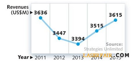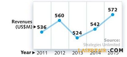 盡管出貨量增加了,打印機(jī)價(jià)格持續(xù)下跌,殘酷的價(jià)格競(jìng)爭(zhēng)侵蝕了銷售額增長(zhǎng)勢(shì)頭。至于2015年,預(yù)計(jì)用于成像應(yīng)用的激光市場(chǎng)將由2014年銷售額6700萬(wàn)美元下降到6600萬(wàn)美元。