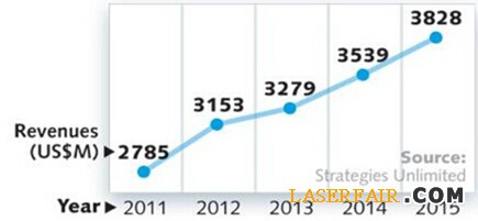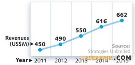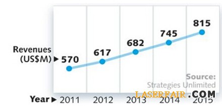 隨著激光影院市場(chǎng)的滲透和激光標(biāo)識(shí)游戲的多樣化,激光照明顯示市場(chǎng)的營(yíng)業(yè)收入持續(xù)固定增長(zhǎng)。事實(shí)上,許多城市正在考慮“消滅”污染,即煙花匯演產(chǎn)生的固體垃圾也將有利于激光燈光秀的發(fā)展。隨著所有激光娛樂(lè)市場(chǎng)的發(fā)展,我們預(yù)測(cè)2015年娛樂(lè)和顯示應(yīng)用的激光市場(chǎng)將增長(zhǎng)近11%達(dá)到1.97億美元。