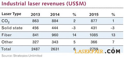 這一增長(zhǎng)將再次由光纖激光器領(lǐng)導(dǎo),但是增長(zhǎng)率略低于2014年。光纖激光器有望繼續(xù)侵蝕CO2和長(zhǎng)脈沖固態(tài)激光器的市場(chǎng)份額。超快脈沖固態(tài)激光器將經(jīng)歷由大型加工應(yīng)用包括AM在內(nèi)的重要銷售增長(zhǎng)。高功率激光器在金屬切割方面應(yīng)用將穩(wěn)定在一個(gè)比較穩(wěn)定的個(gè)位數(shù)增長(zhǎng)速度上,但是用于焊接的激光器預(yù)計(jì)在2015年增長(zhǎng)兩位數(shù)。
