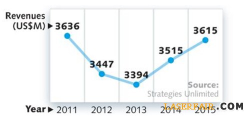 盡管出貨量增加了,打印機價格持續(xù)下跌,殘酷的價格競爭侵蝕了銷售額增長勢頭。至于2015年,預計用于成像應用的激光市場將由2014年銷售額6700萬美元下降到6600萬美元。